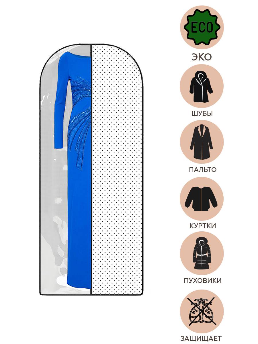 Чехол идеально подходит для хранения или транспортировки длинных платьев, пальто, шубы или пуховика. Защищает от загрязнений, моли или других насекомых. Застегивается на молнию, имеет отверстие для вешалки. Изготовлен из спанбонда. Это прочный, дышащий и экологический материал, не вызывает аллергии. Вес: 190 г Материал: спанбонд Размер упаковки: 28x25x3 см Размер товара: 150x60 см Страна: Россия