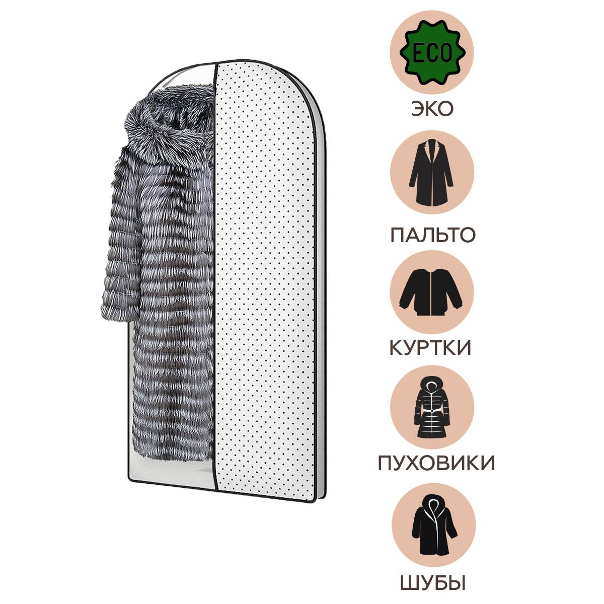 Чехол из экологического материала, спанбонд, идеально подойдет для хранения верхней одежды: шуб, курток или пальто, благодаря своей объемной конструкции. Надежно защищает от пыли, грязи и насекомых, при этом чехол выполнен из дышащего материала. Будет незаменим при транспортировке одежды. Чехол застегивается на молнию, имеет отверстие для вешалки. Белый цвет поможет создать ощущение чистоты и уюта.