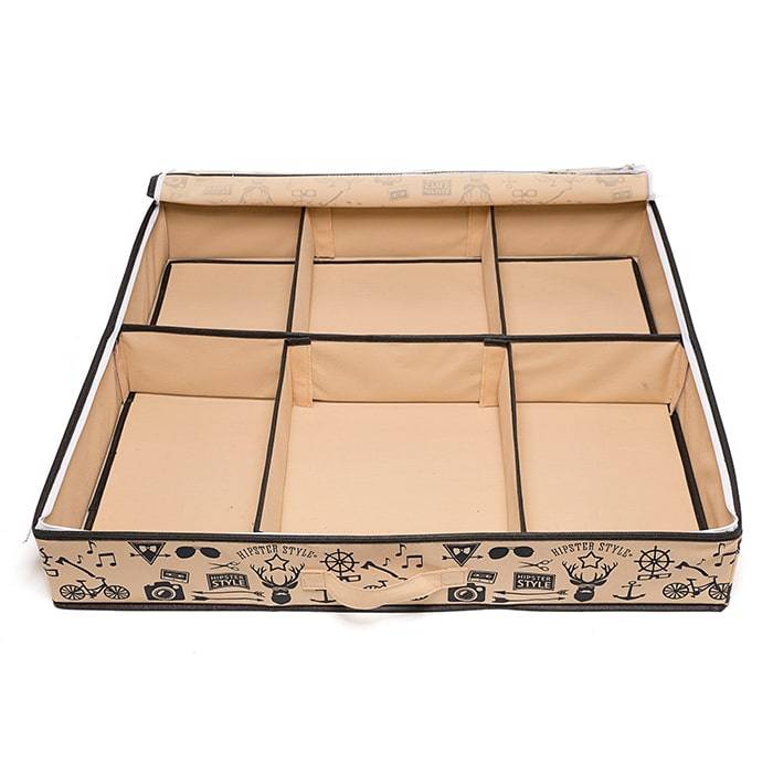 Очень удобный способ хранить сезонную обувь. Шесть больших отделений размером 20Х32см вмещают 6 пар обуви большого размера, а так же обувь с каблуком и сапоги. Органайзер плоский, удобно хранить под кроватью или диваном. Внутренние секции можно моделировать под размеры обуви, например высокие сапоги. Имеет жесткие борта, что является гарантией сохранности вещей.