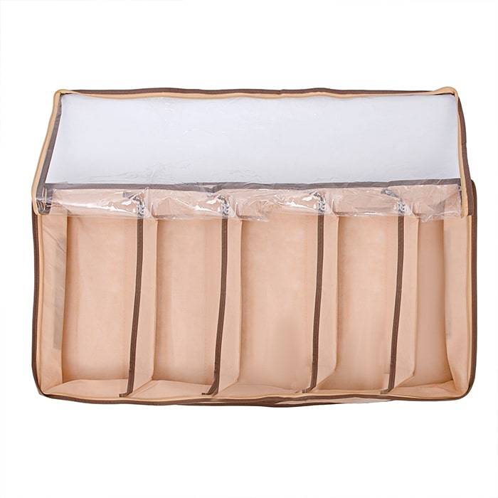 Органайзер на 5 пар обуви, застегивается на молнию, имеет прозрачную крышку из ПВХ, что позволяет видеть содержимое органайзера. Защищает обувь от пыли и повреждений. Выполнен в универсальной бежево-коричневой расцветке, благодаря чему, гармонично впишется в любой интерьер.