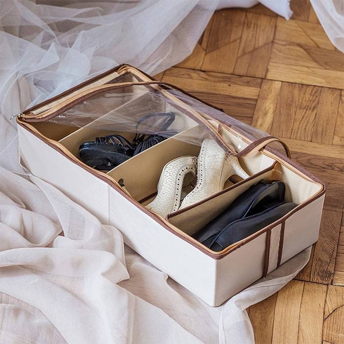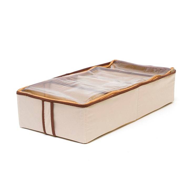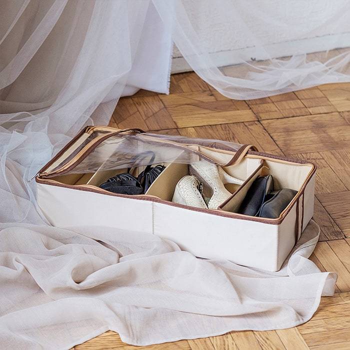 Очень удобный способ хранить сезонную обувь. Четыре отделения размером 10Х5см вмещают 4 пары обуви. Органайзер плоский, удобно хранить под кроватью или диваном. Внутренние секции можно моделировать под размеры обуви, например высокие сапоги. Имеет жесткие борта, что является гарантией сохранности вещей.
