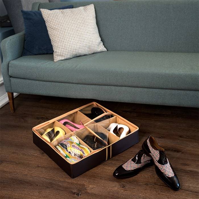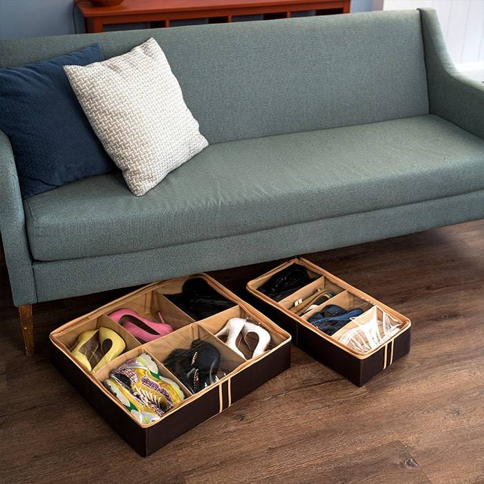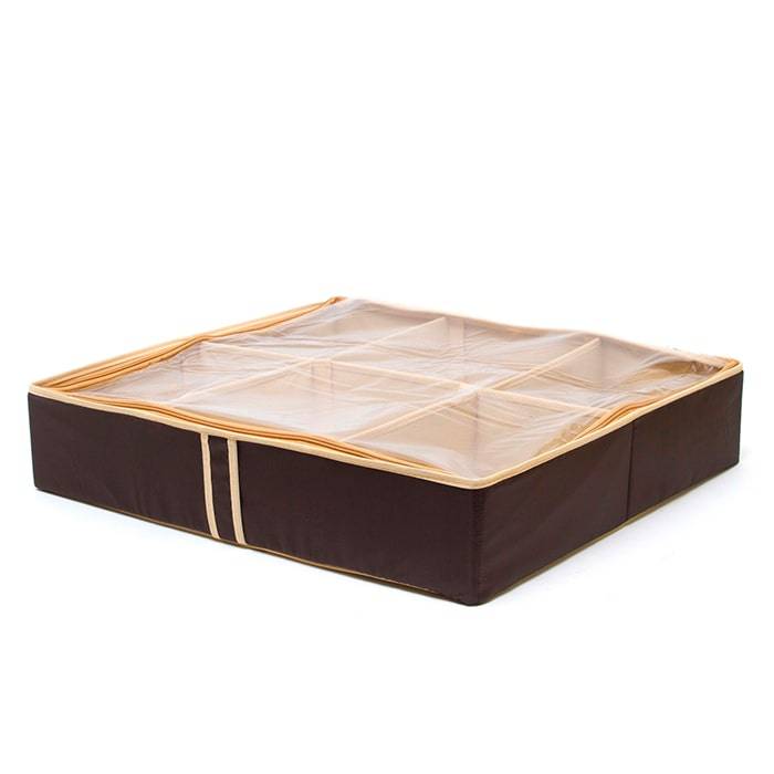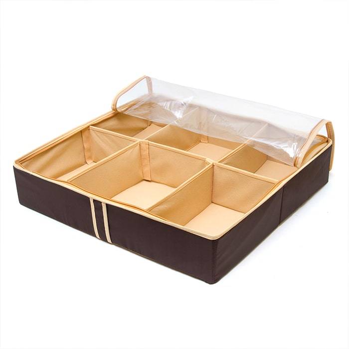 Очень удобный способ хранить сезонную обувь. Шесть отделений размером 26Х18 см вмещают 6 пар обуви, высокий каблук, сапожки. Органайзер плоский, удобно хранить под кроватью или диваном. Внутренние секции можно моделировать под размеры обуви, например высокие сапоги. Имеет жесткие борта, что является гарантией сохранности вещей.