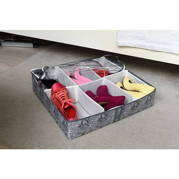 Аккуратно и бережно убрать на хранение целых шесть пар сезонной обуви вам поможет органайзер «Grey Flower». Кроме заметной экономии места в шкафу или кладовой, он обеспечит вам сохранность любимых ботинок или туфель. Дышащий материал и плотно застегивающаяся крышка чехла защитят обувь от пыли или влаги и, при этом, создадут хорошую вентиляцию.