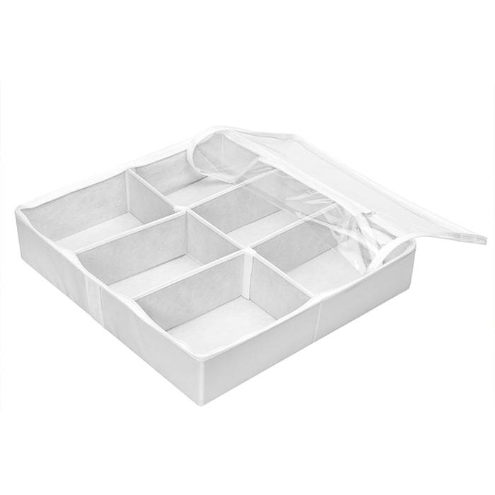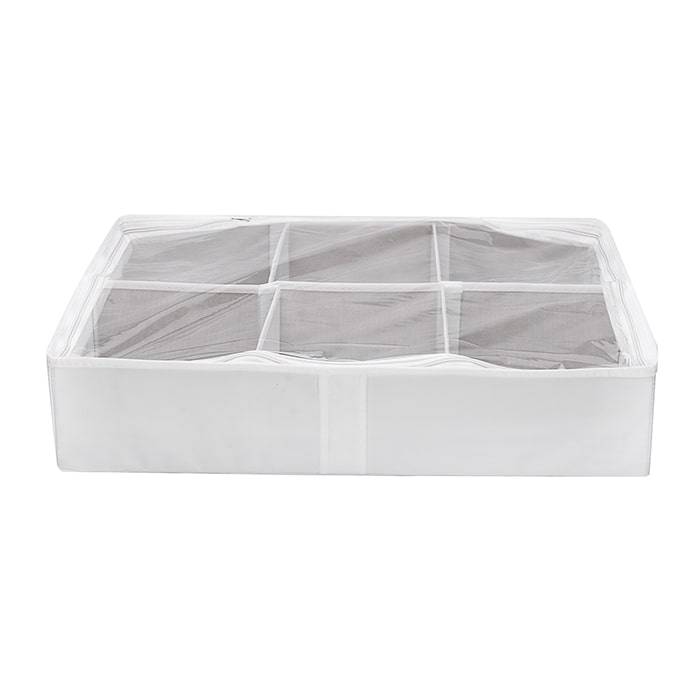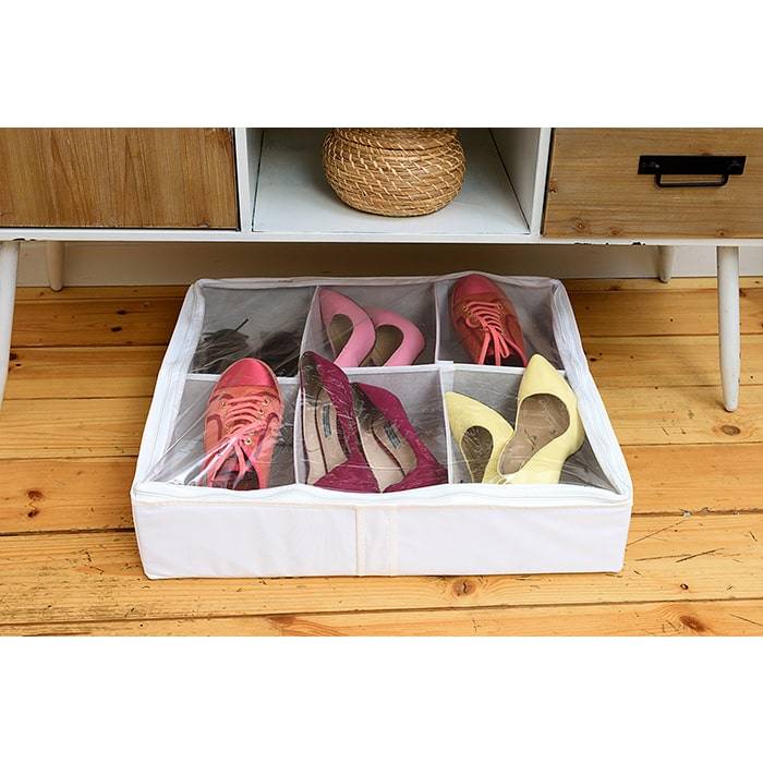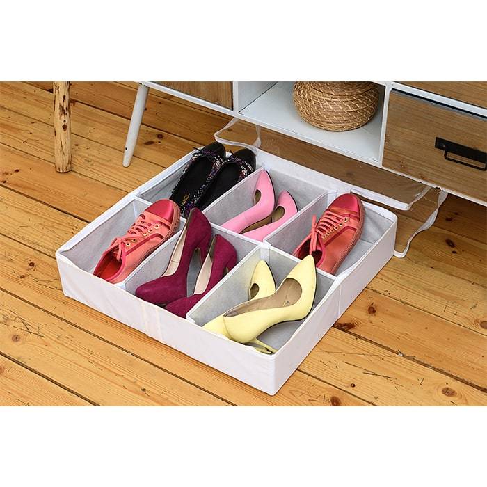 Упаковав шесть пар обуви в отдельные ячейки органайзера, который вы можете спокойно убрать в кладовку или, например, спрятать под шкаф и быть уверены, что к следующему сезону ваши любимые туфли останутся такими же новыми, чистыми и аккуратными. Жесткие боковые стенки не дадут каблукам поцарапать или повредить другую обувь, замша не покроется пылью, а нежная кожа не помнется и не потрескается.