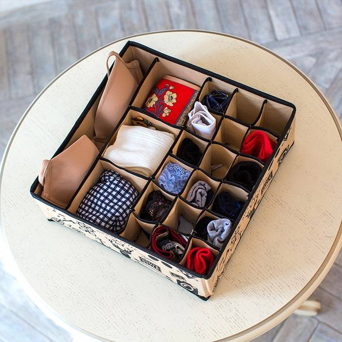 Супер универсальный органайзер с секциями разного размера наведет порядок в любом ящике комода или на полке. Благодаря размерам ячеек, вы легко сможете хранить в нем вещи такие, как футболки, нижнее белье, носки, шапки и многое другое. Имеет жесткие борта, что является гарантией сохранности вещей. Подходит в шкафы Били от Икея.