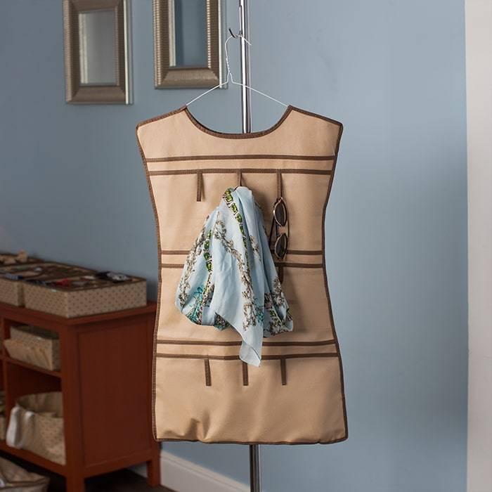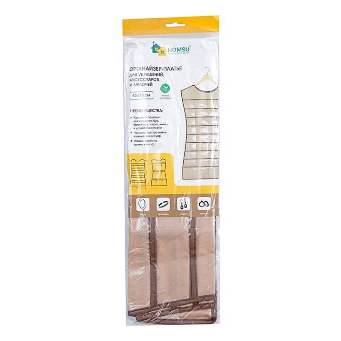 Органайзер в форме платья имеет множество прозрачных кармашков, благодаря чему идеально подходит для хранения серег, браслетов, колец и других мелких украшений. Органайзер можно установить на вешалке и повесить прям в шкаф.