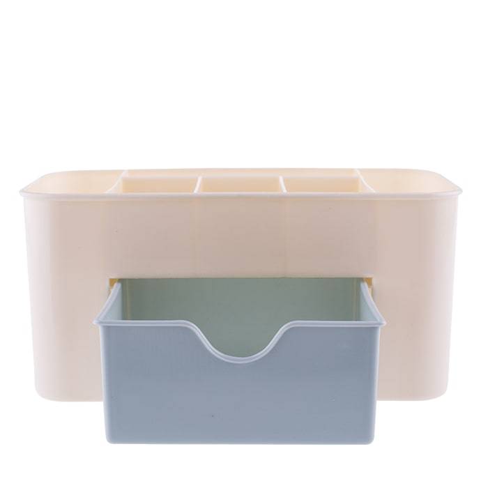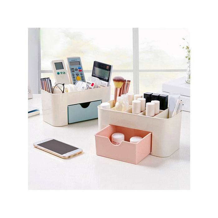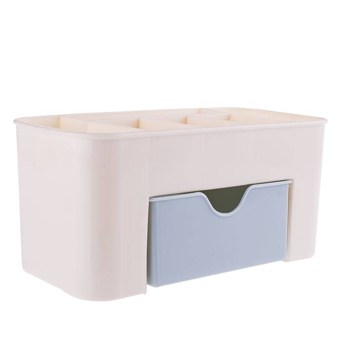 Нежный молочно-голубой органайзер для косметики станет идеальным помощником для стильной и практичной девушки, которая поддерживает порядок в своих вещах. Верхний ярус состоит из отсеков, куда можно поместить кисточки, крема, любимые духи и много других необходимых вещей. Также имеется вместительный выдвижной нижний ящик, в котором удобно разместятся все ваши любимые косметические продукты.
