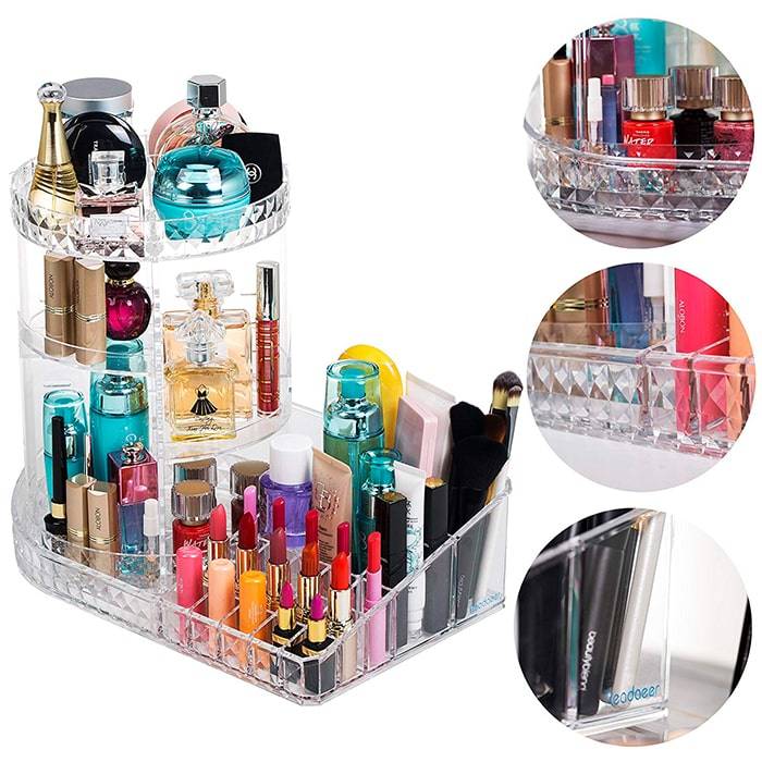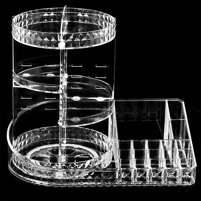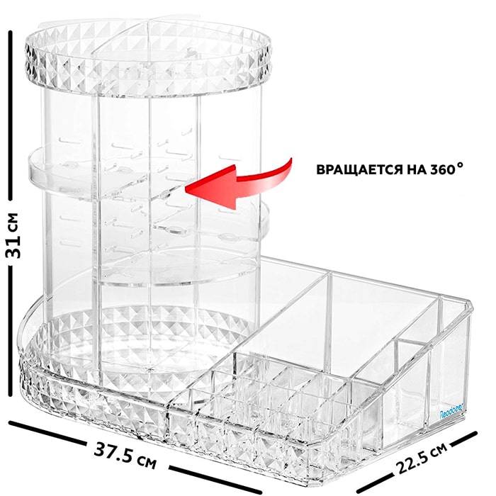 Косметики много не бывает, бывает просто недостаточно для нее места на туалетном столике. Чтобы решить эту проблему, достаточно приобрести универсальный мульти-органайзер для косметики «Diamond». Разделен на секции разного размера, что позволяет хранить крема, пудру, тональную основу, а также кисточки, карандаши и прочее. Вращающийся механизм позволит быстро найти необходимую вещь.