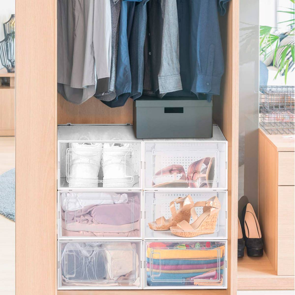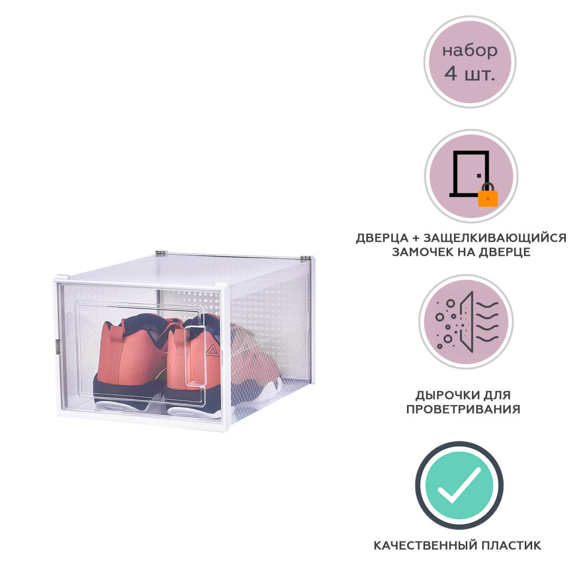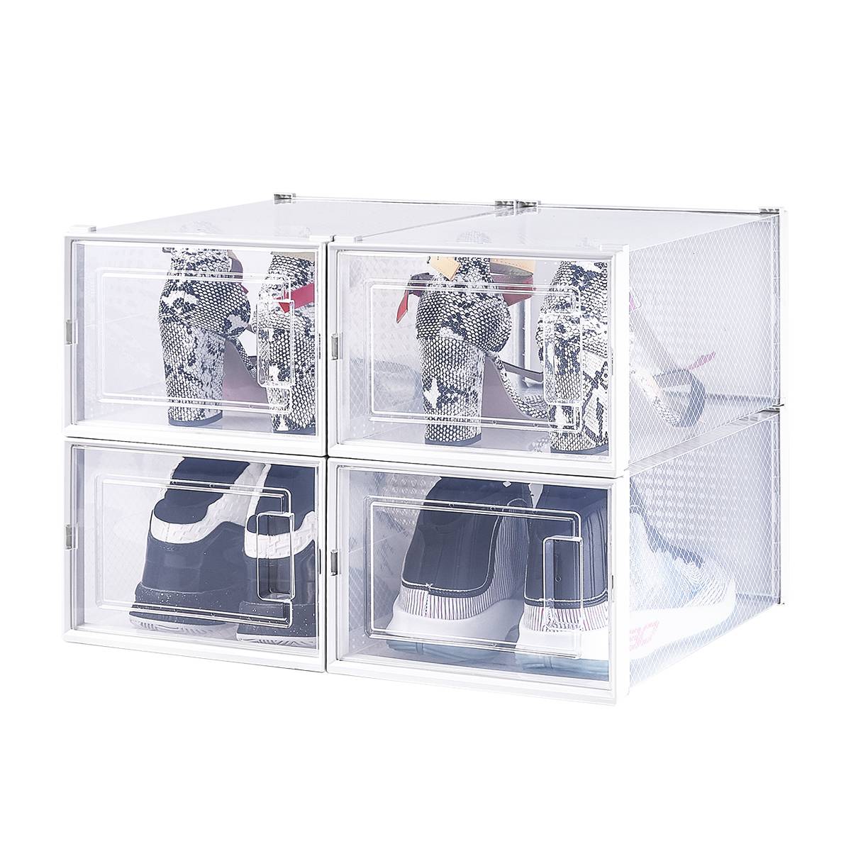 Набор коробок для обуви большого размера Premium из 4 штук идеально подойдет для хранения обуви, например, кроссовок, ботинок или туфель. Каркас изготовлен из высококачественного прочного пластика, который легко чистится. На задней стороне расположены небольшие вентиляционные отверстия. Коробки крепятся друг к другу, образуя устойчивую конструкцию. Каждая оснащена открывающимся окошком на передней стенке, что позволит без проблем достать содержимое.