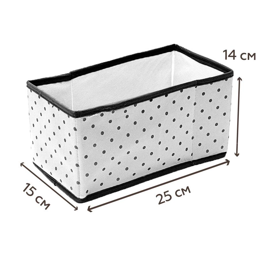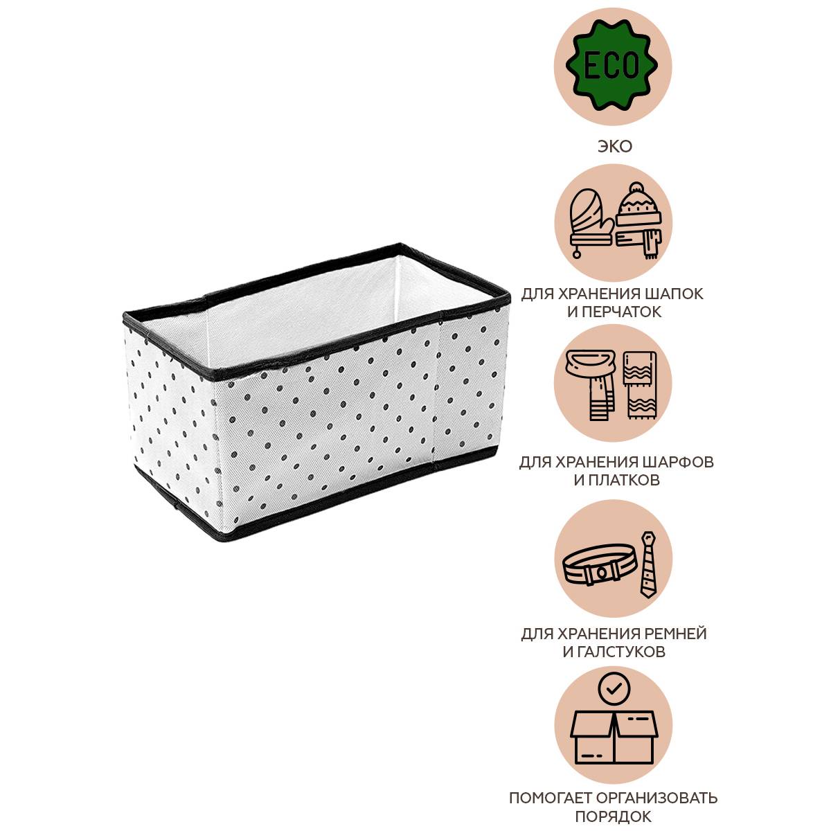 Коробка прекрасно подойдет для хранения шарфов, перчаток, шапок и других аксессуаров. Изделие прекрасно держит форму за счет картонных вставок. Материал изготовления - спанбонд. Это экологический, безопасный и не аллергенный материал. Выполнен в белом цвете, благодаря чему отлично впишется в любой интерьер. Вес: 146 г Материал: спанбонд, картон Размер упаковки: 26х17х3 см Размер товара: 28x15x14 см Страна: Россия