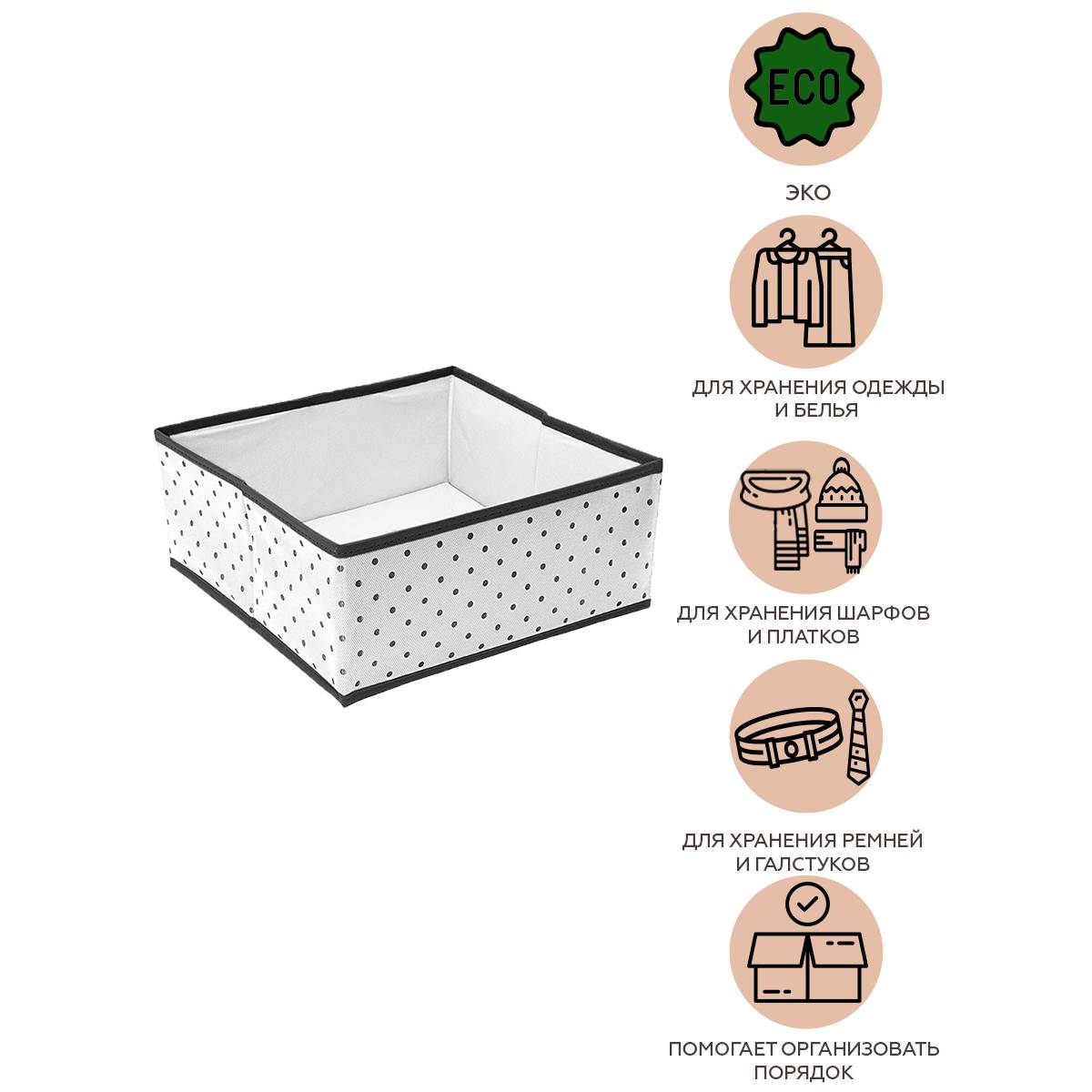 Такая коробка идеально подойдет для хранения шарфов, шапок, перчаток, платков и других аксессуаров. Отлично держит форму, благодаря картонным вставкам. Выполнена из спанбонда - это экологический, прочный и дышащий материал. А белый цвет создаст чувство чистоты и свежести в доме. Вес: 245 г Материал: спанбонд, картон Размер упаковки: 31х32х2 см Размер товара: 30x30x13 см Страна: Россия