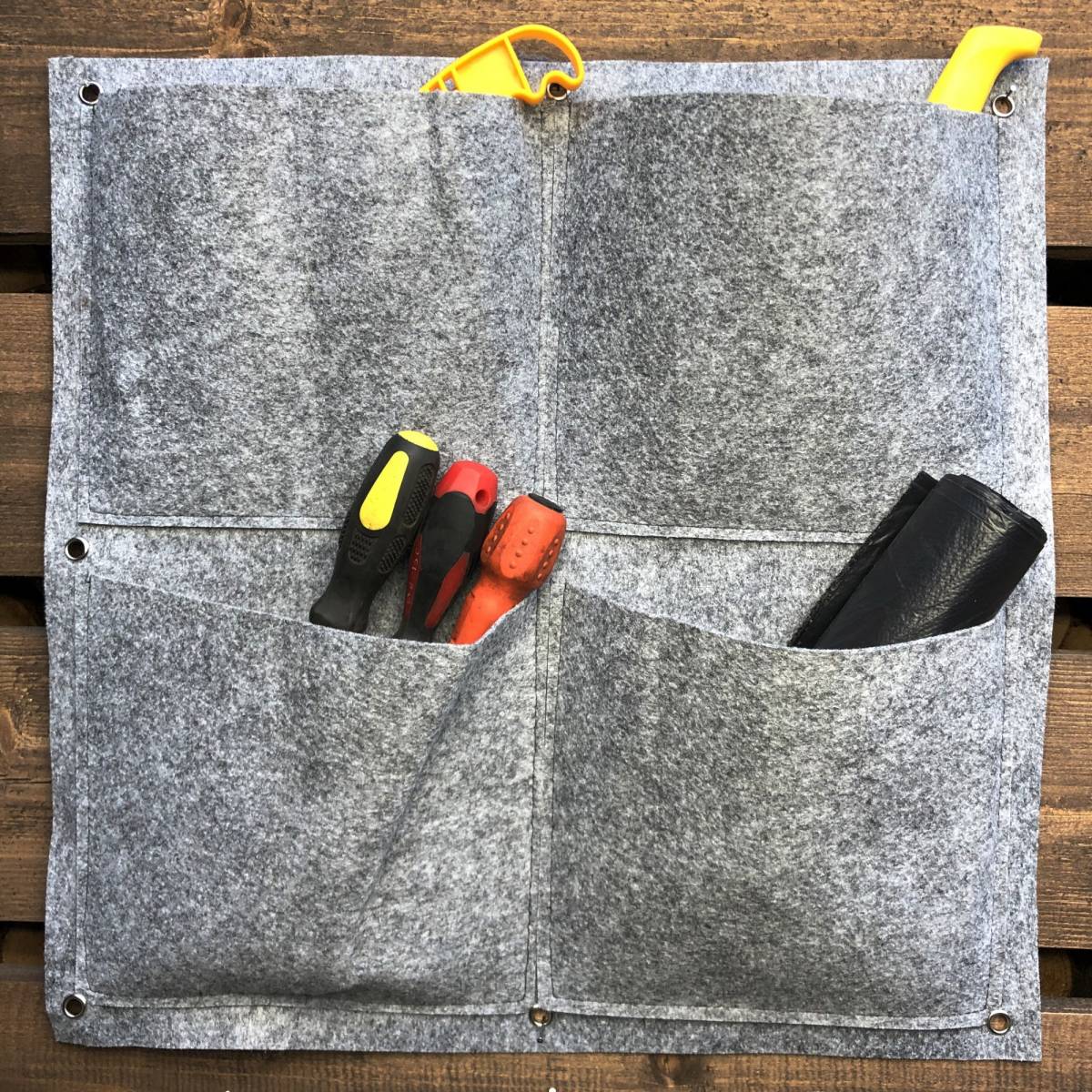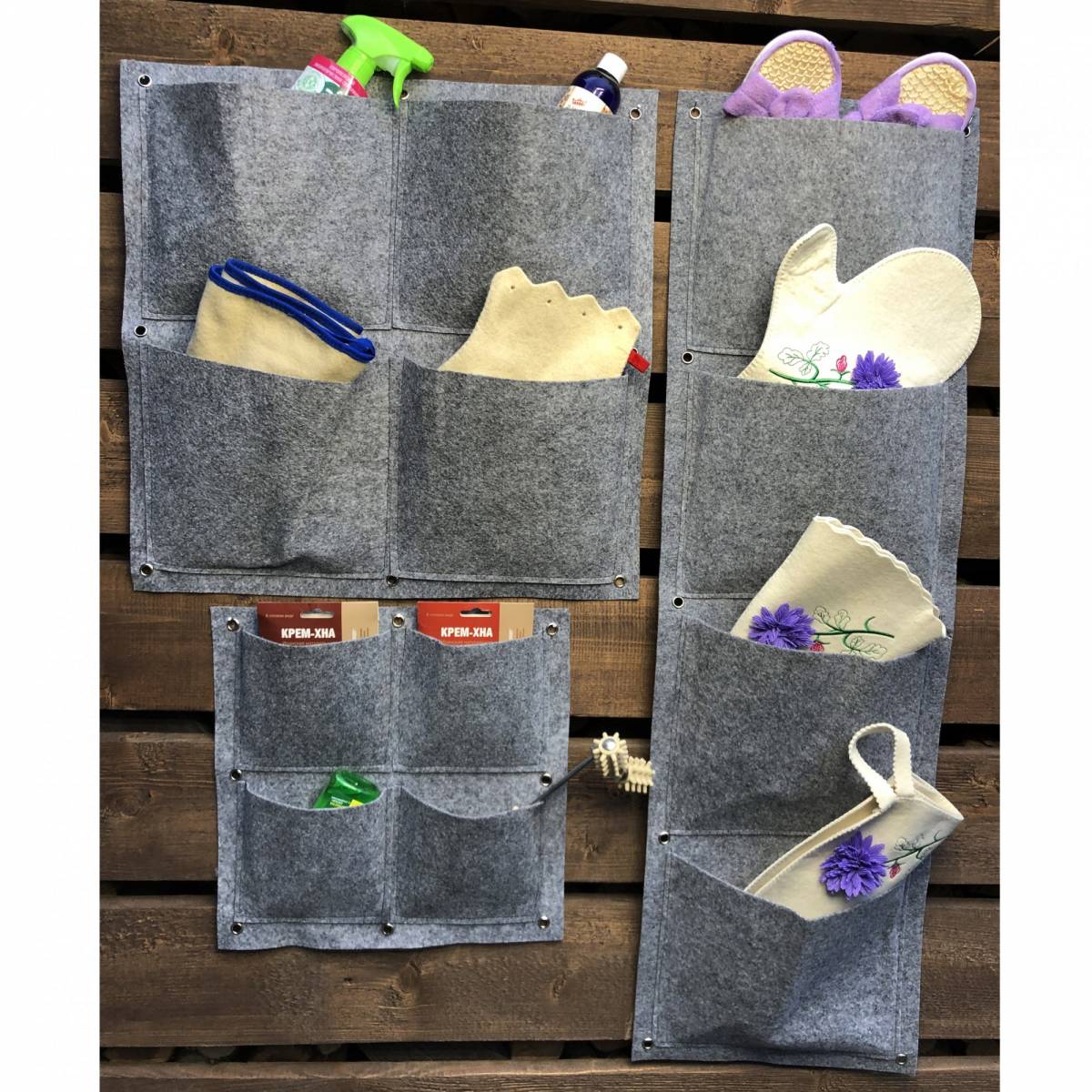 Большой навесной органайзер из фетра прекрасно подойдет для хранения нужных вещей, который обычно разбросаны по комнате: пульт от телевизора, различные гаджеты, журналы, зарядные устройства, блокноты и книги. Также прекрасно впишется на кухню, в ванную комнату или в детскую. Имеет четыре кармана и нейтральный серый цвет. Органайзер очень прочный и прослужит не один год.