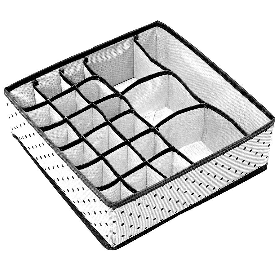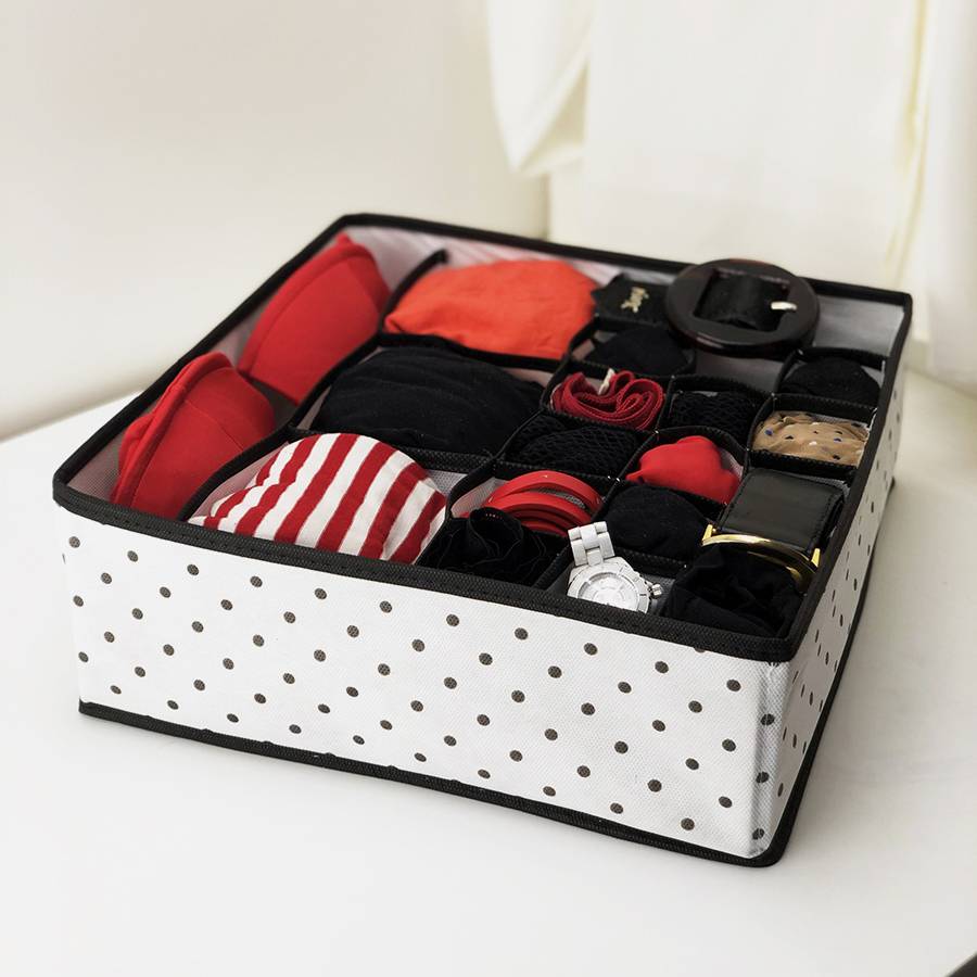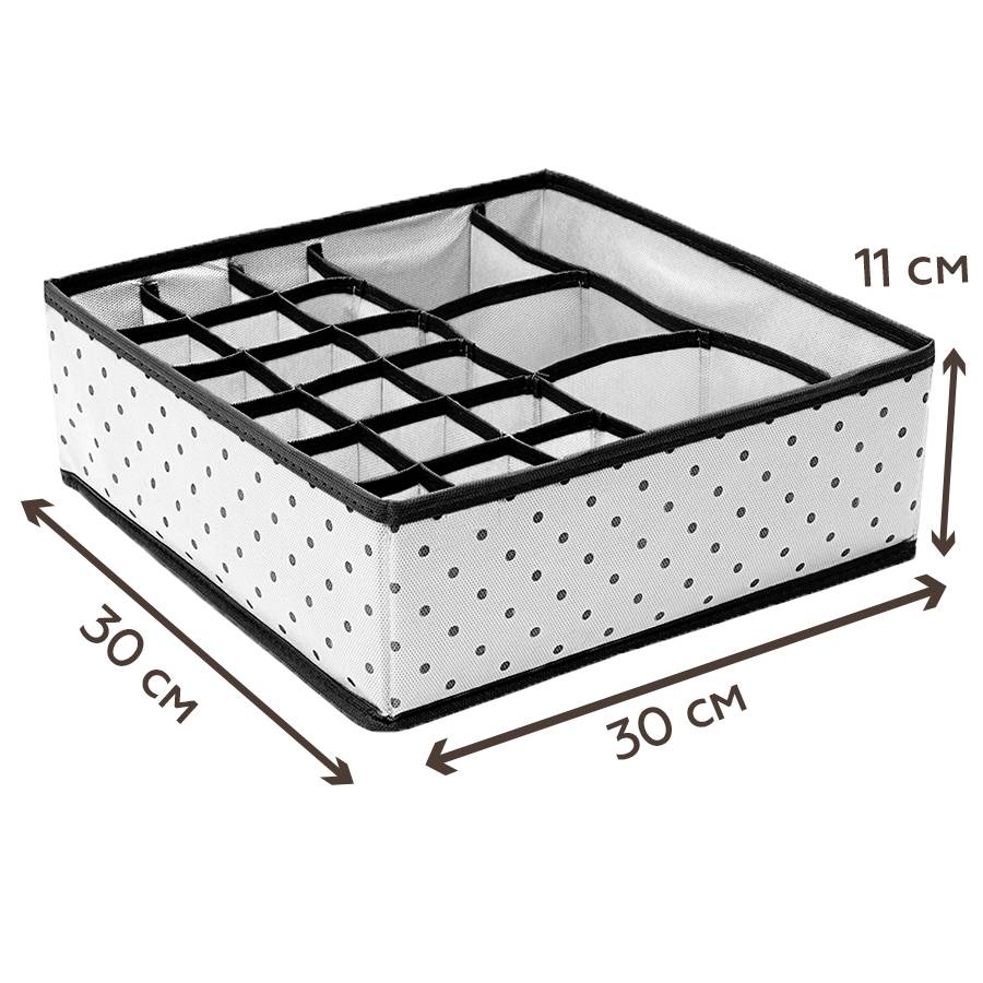 Универсальный органайзер, в котором можно хранить любое белье или аксессуары. Изделие имеет 18 ячеек, 3 квадратных секции и одну продольную. Выполнен из экологического материала - спанбонд. Стенки укреплены картонными вставками. Выполнен в универсальном дизайне, в белом цвете. Вес: 200 г Материал: спанбонд, картон Размер упаковки: 30х11х3 см Размер товара: 30х30х11 см Страна: Россия