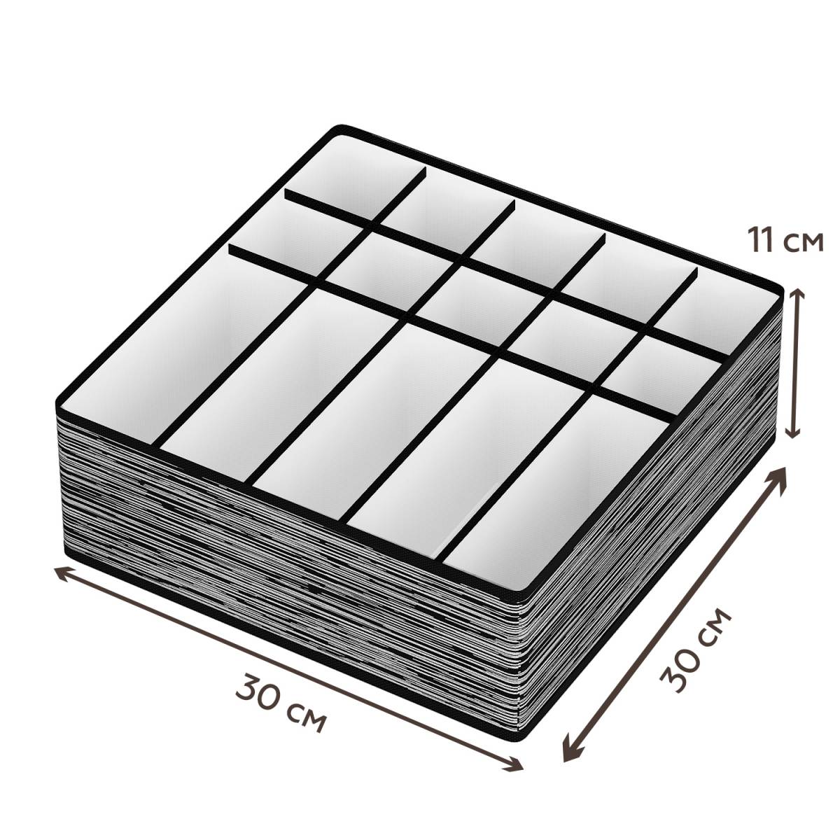 Универсальный органазер для хранения, благодаря которому у каждой вещи будет свое место. Имеет 10 квадратных и 5 промоугольных ячеек, которые идеально подойдут для хранения нижнего белья, носков, бюстгалтеров или галстуков. Выполнен из спанбонда - это экологический, прочный и дышащий материал. Благодаря своему цветовому решению и дизайну прекрасно впишется в любой интерьер. Вес: 200 г Материал: спанбонд Размер упаковки: 30х11х3 см Размер товара: 30х30х11 см Страна: Россия