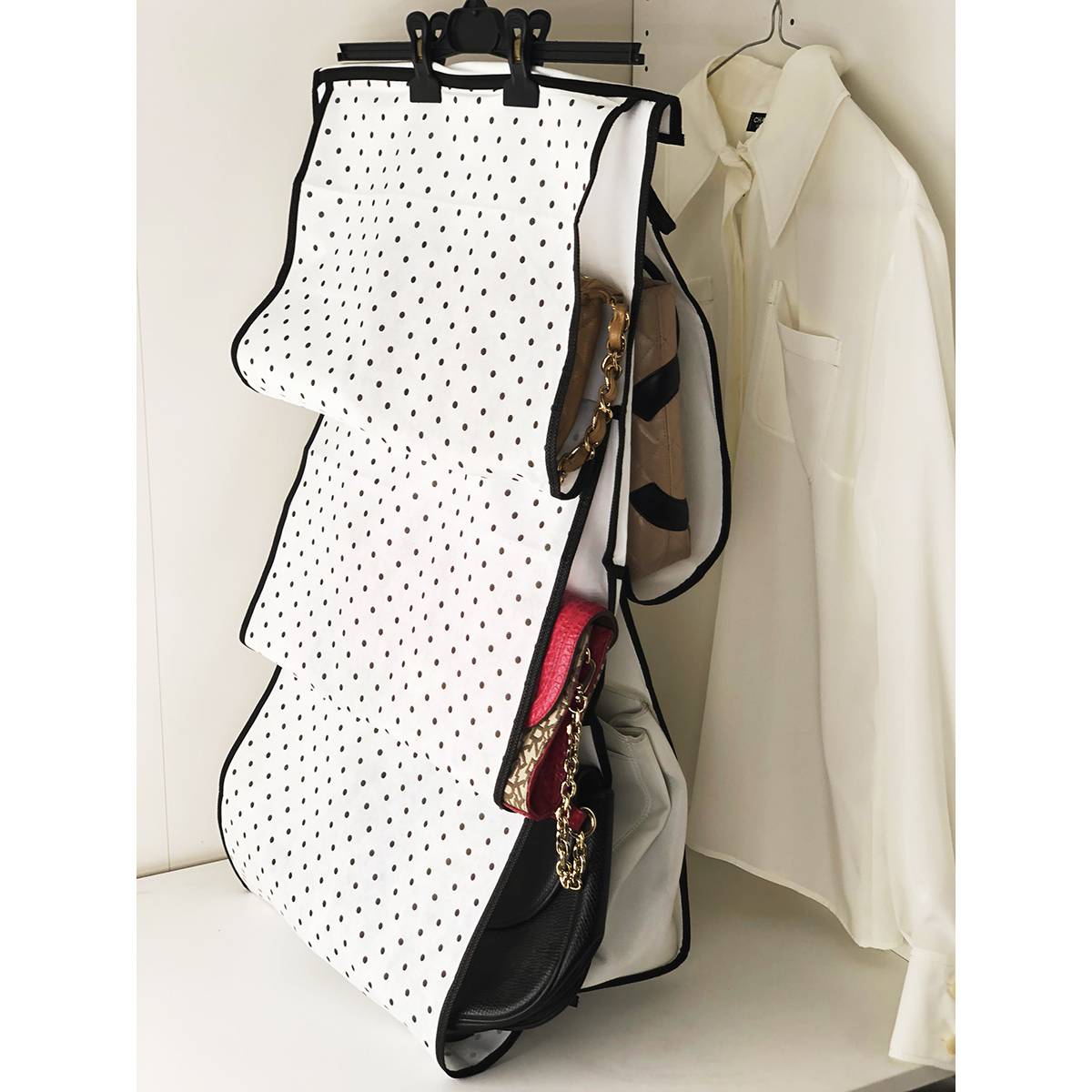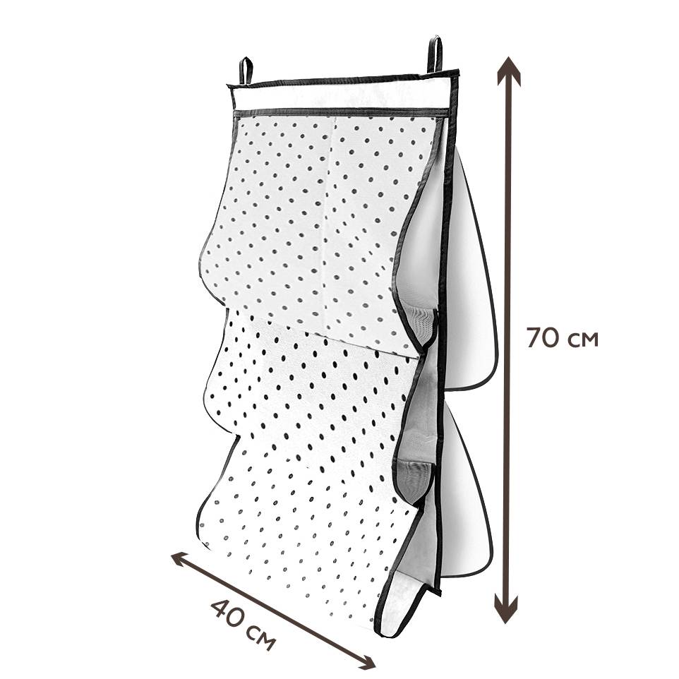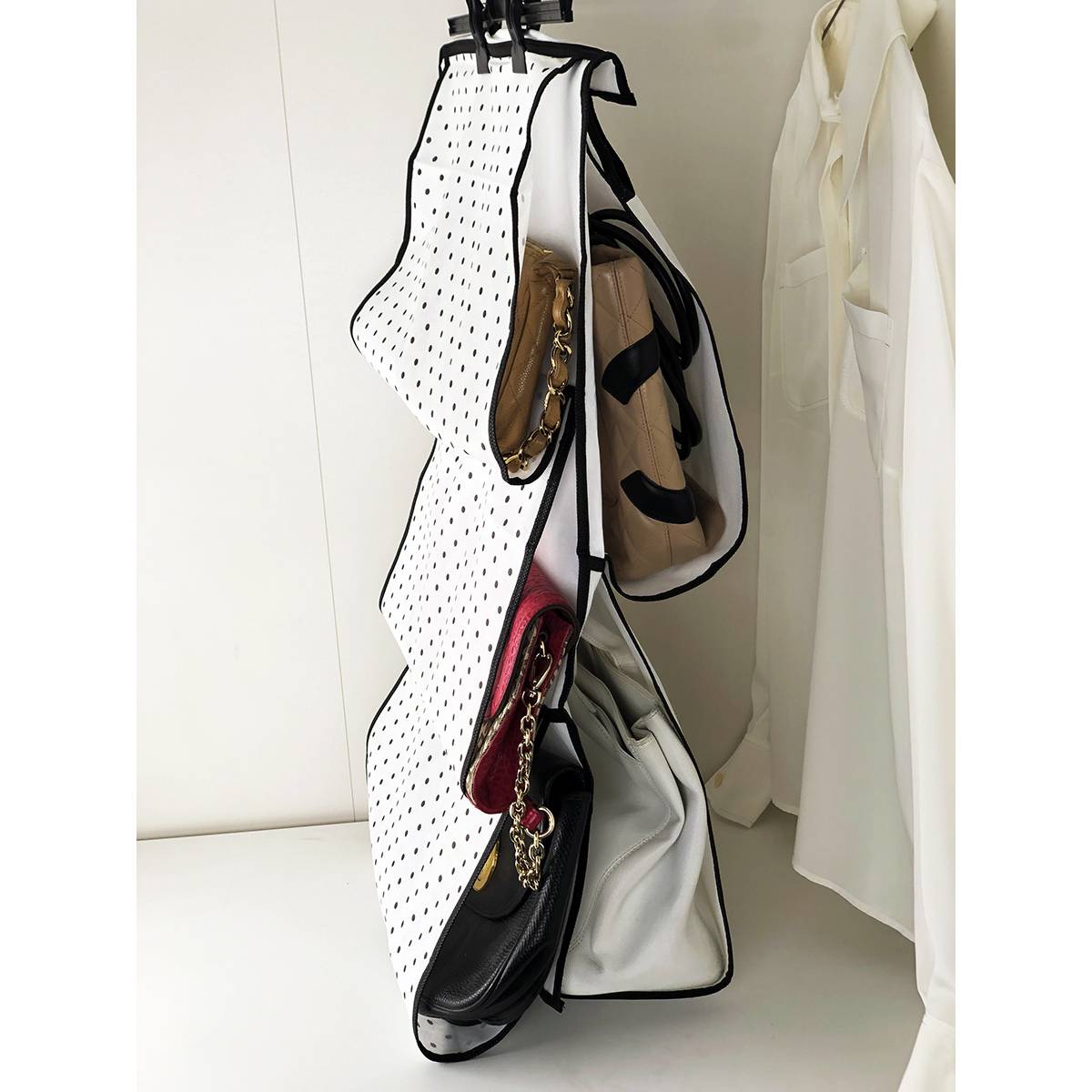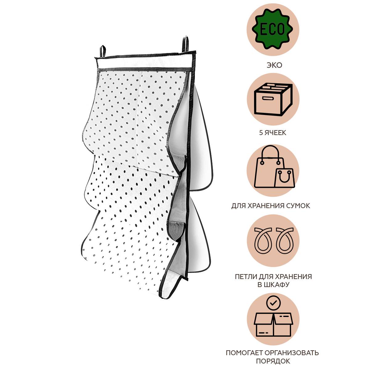 Органайзер для хранения сумок имеет пять отделений под сумки разного размера: два больших кармана большого размера и три поменьше. Можно повесить на вешалку за две петельки сверху, благодаря чему сэкономить место в шкафу. Защищает сумки от пыли и повреждений. Выполнен из спанбонда. Это прочный, дышащий и экологический материал. Белый цвет прекрасно впишется в любой интерьер и создаст ощущение чистоты. Вес: 86 г Материал: спанбонд Размер упаковки: 41х16,5х2 см Размер товара: 40x70 см Страна: Россия