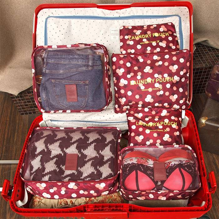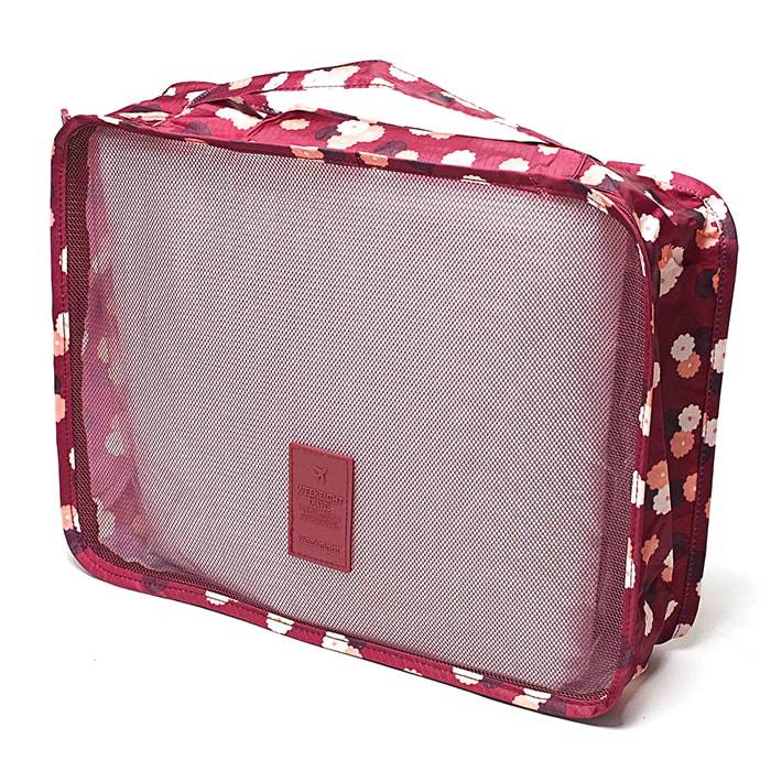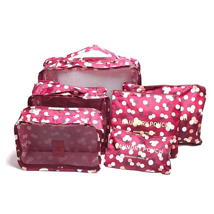 Как не деформировать вещи при перевозке в чемодане? Для этого разместите в нем 6 органайзеров для багажа «Бордовый цветок». С таким набором вы не потеряете вещи и забудете о мятой одежде. Благодаря милым компактным сумочкам можно без труда перевезти множественные средства личной гигиены, необходимые медикаменты, белье и другие предметы. При своей компактности набор достаточно вместительный.