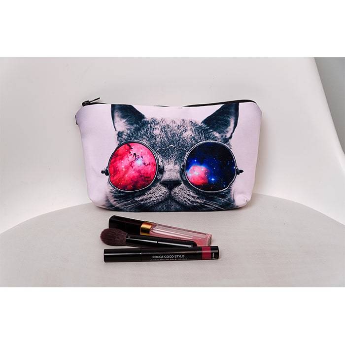 Яркая и забавная косметичка «Кот в очках» придется по вкусу молодым и стильным девушкам, для которых важно не только удобство, но и эстетика оформления вещей, которые лежат в их сумочке. В небольшой по размеру косметичке с легкостью поместится все, что может быть необходимо вам в течение дня: пилочка для ногтей, губная помада, тушь для ресниц, крем и т.д.