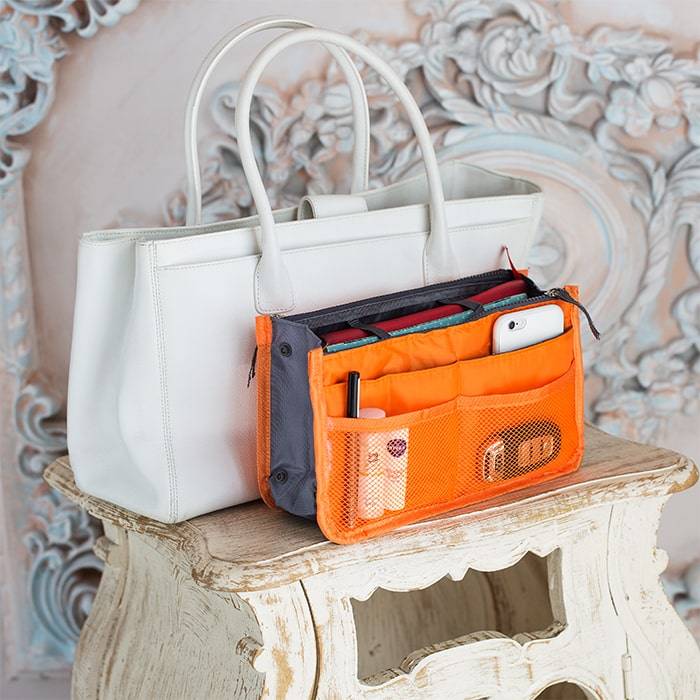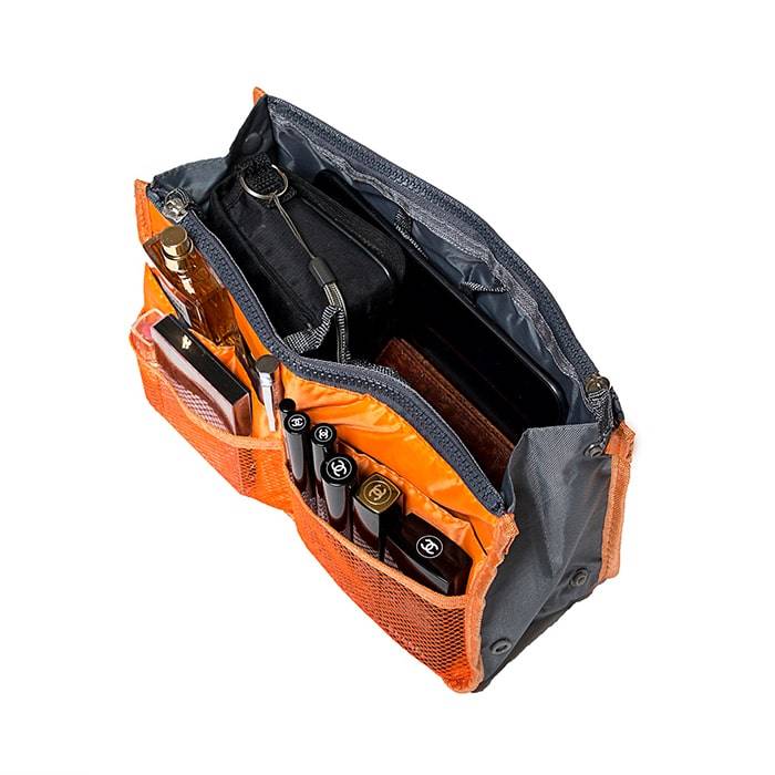 Этот органайзер для сумки благодаря трем вместительным отделениям для вещей, четырем кармашкам по бокам и шести кармашкам в виде сетки обеспечит полный порядок в вашей сумке. Кроме того, изделие обладает интересным стилем, выполнено в оранжевом цвете и оснащёно двумя крепкими ручками, что позволяет применять его и вне сумки, как отдельный аксессуар.