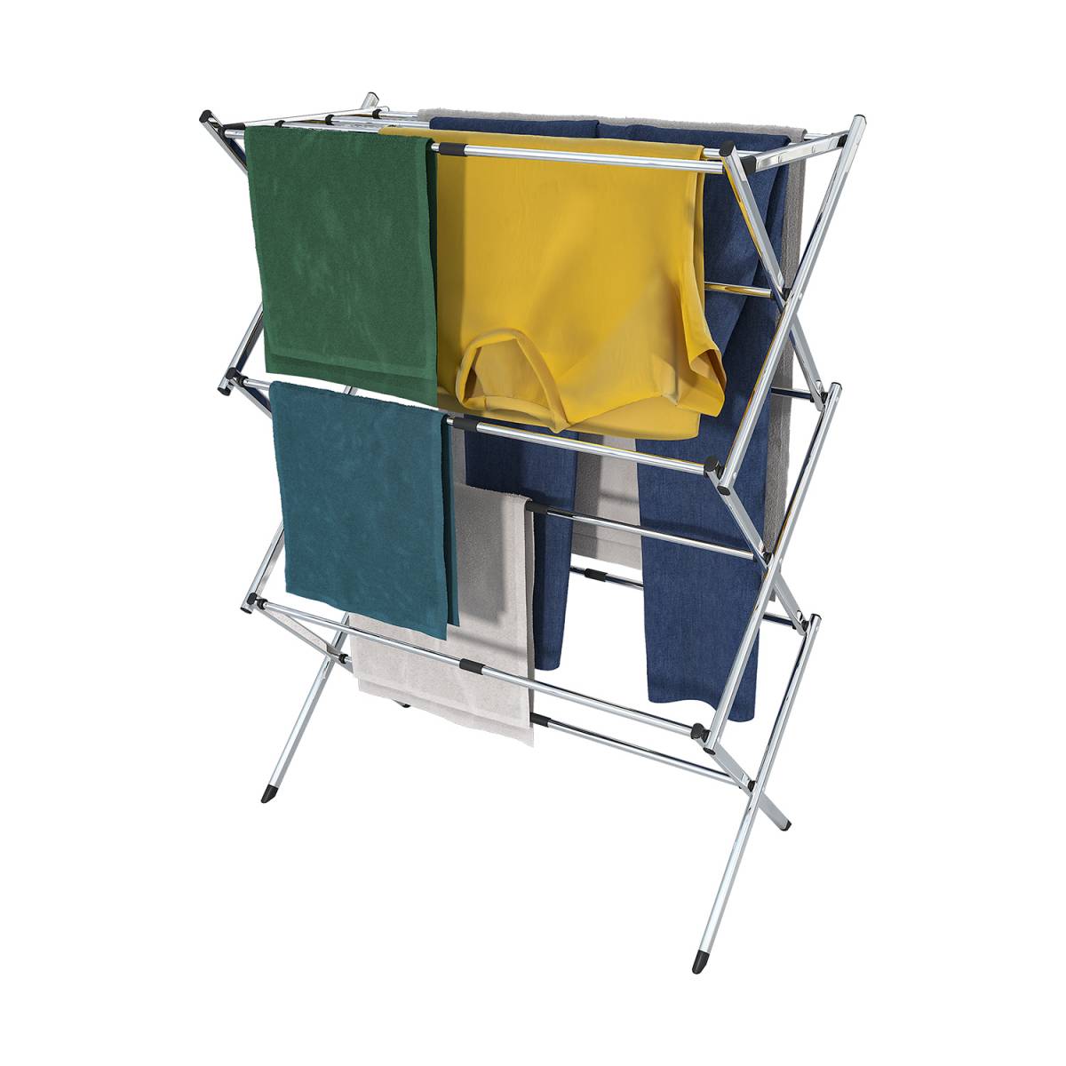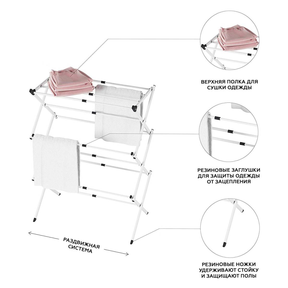 Сушилка для белья уникальной конструкции, которая легко и быстро собирается или складывается. В сложенном состоянии сушилка занимает минимум места и может храниться под диваном или в шкафу. В собранном виде сушилка высокая и может раздвигаться по ширине от 43 до 75 см, что позволяет ее эффективно использовать в любом месте. Прочная и устойчивая конструкция выдерживает до 10 кг белья. Вес: 2,116 кг Материал: металл, пластик Размер упаковки: 52x43x9 см Размер товара: 43 (75)x37x103 см Страна: Китай