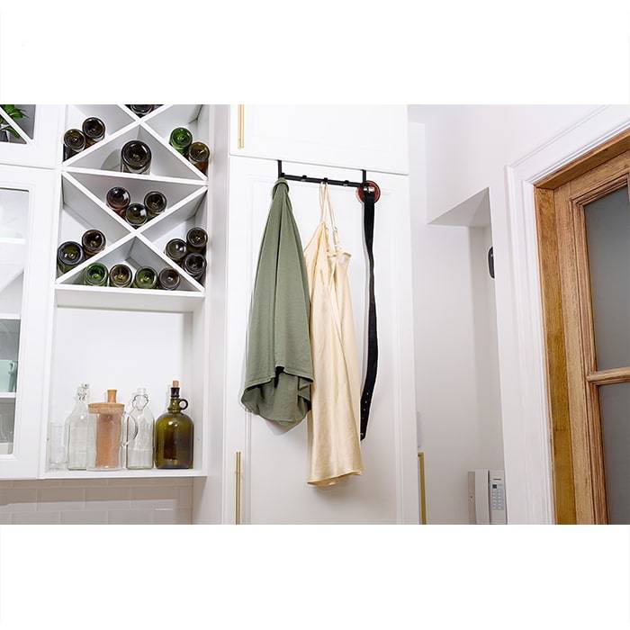 Вешалка закрепляется на верхнем крае двери для рационального использования пространства. Можно повесить халаты, полотенца или сумки.